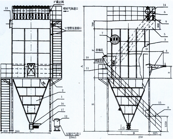 1、支架 2、灰斗 3、过滤箱体 4、进风口 5、上箱体 6、喷吹系统 7、滤袋组合 8、扶梯平台 9、提升阀 10、防爆孔 11、测温孔 12、压气系统 13、出风口 14、清灰现场箱 15、卸灰阀现场箱 16、插板阀 17、卸灰阀